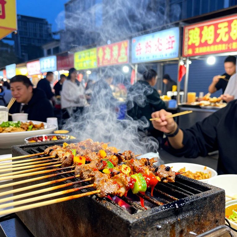 Appetizing street food scene capturing sizzling skewers of grilled meats and vegetables, steam rising in the cool evening air, vibrant sauces dripping, bustling market stalls with colorful signs, excited people enjoying food, urban night setting with lively atmosphere.