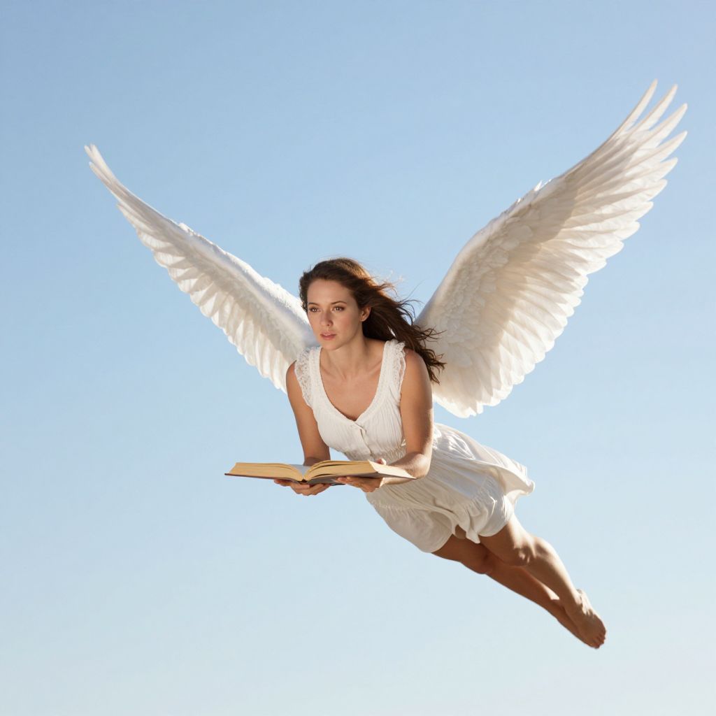 A woman with expansive, feathered wings soars gracefully through the air, her hands firmly gripping an open book whose pages flutter as if alive, symbolizing the power of knowledge and imagination.