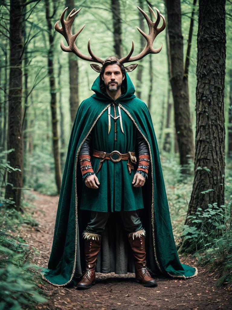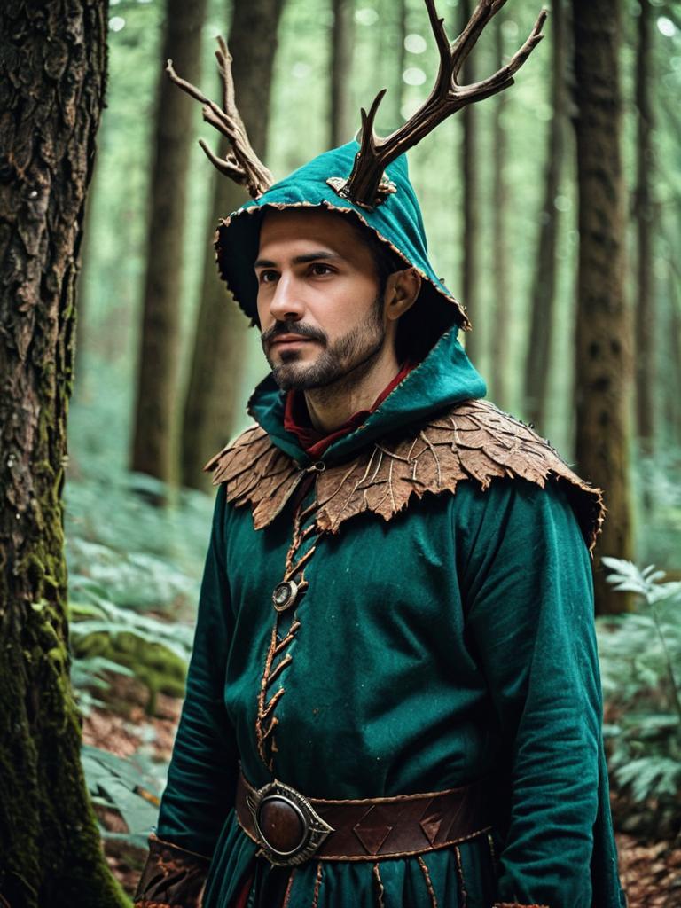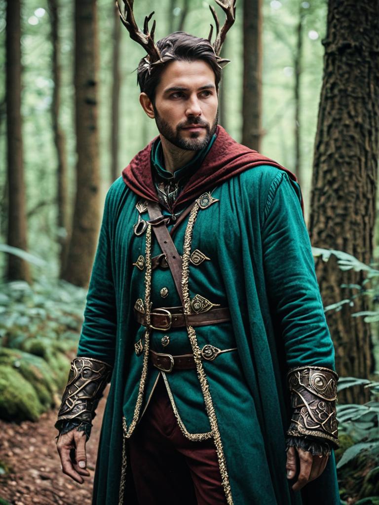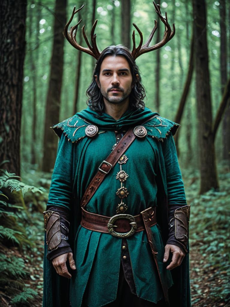A photorealistic portrait of a man dressed in a detailed fantasy cosplay costume set in an enchanted forest. The subject wears a green cloak with ornate buttons, leather wrist guards, and a large belt with a circular buckle. He has long dark hair and wears large antler headgear, adding to the mystical and cinematic atmosphere of the image.