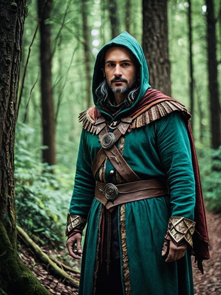Man in Enchanted Forest Costume, photorealistic fantasy cosplay portrait, cinematic realism