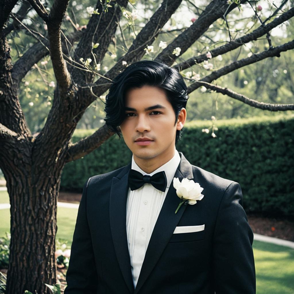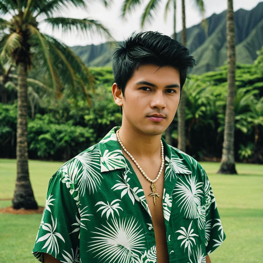 Matching hawaiian outfit,1boy, male focus, solo, hawaiian shirt, palm tree, shirt, tree, necklace, looking at viewer, outdoors, green shirt, realistic, short hair, jewelry, open shirt, day, floral print, black hair