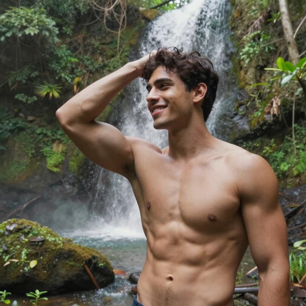 Photograph of a shirtless, fit young man with short, dark hair and a light tan standing in a lush, green forest. He's smiling and raising one hand to his head. In the background, there's a cascading waterfall surrounded by dense foliage. The man's toned, muscular build and smooth skin contrast with the vibrant, natural greenery. The overall vibe is relaxed and natural.