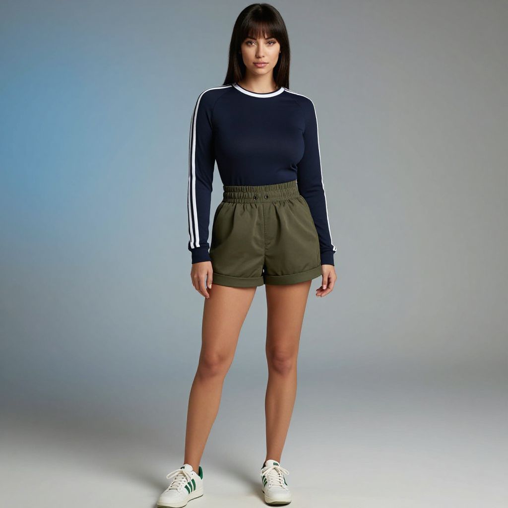 "Woman, sporty casual, dark blue long-sleeve top with white stripes on the sleeves, ribbed collar and cuffs, paired with high-waisted olive green shorts with a cuffed hem, white lace-up sneakers with green detailing, simple, sleek hair with bangs, photo studio background with a gradient blue to neutral tone.. Sexy. Pretty face and beаutiful eyes. Big breasts."