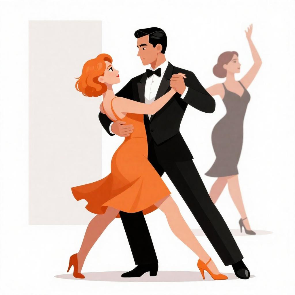 A vintage-style illustration shows a mid-20th century couple dancing, with the man in a brown shirt and the woman in an off-shoulder yellow dress, both smiling. A smaller inset image of a woman in a red dress with black hair is in the top right. A leopard figure is partially visible on the left.