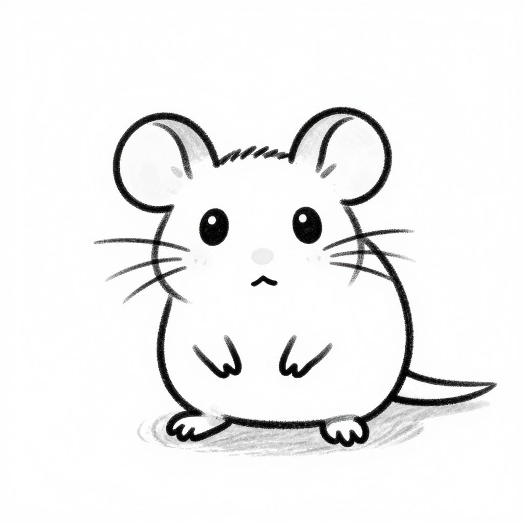 Rat sketch easy, black and white simple rat drawing in a cartoon style, large eyes and small paws, composed of minimal strokes and soft shading, easy beginner sketch project, isolated on clean background for clarity.
