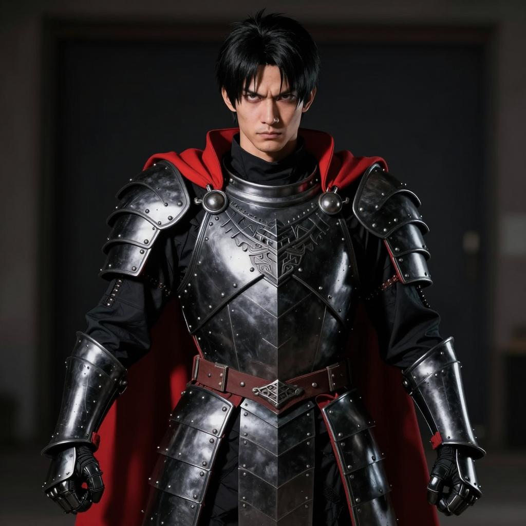 Portrait of an Asian man dressed in a realistic, highly detailed cosplay costume inspired by the character Guts from Berserk manga and anime. The subject wears black armor with intricate plating and rivets, paired with a striking red cape. Dramatic lighting highlights the intense facial expression and the sharp details of the armor.