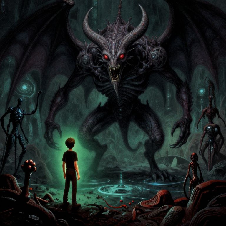 A digital fantasy artwork depicts a dark, cavernous scene illuminated by a green glow. A small, silhouetted human with short dark hair stands with their back to the viewer, facing a massive, menacing black demon with glowing red eyes and large, twisted horns. The demon's skeletal frame and muscular limbs dominate the center. Surrounding the demon are smaller, dark creatures with glowing blue eyes and mechanical parts. A circular, blue-lit pool is in the foreground, with red, fleshy tendrils scattered around. The image exudes a sense of danger and confrontation, with a dark, ominous atmosphere.