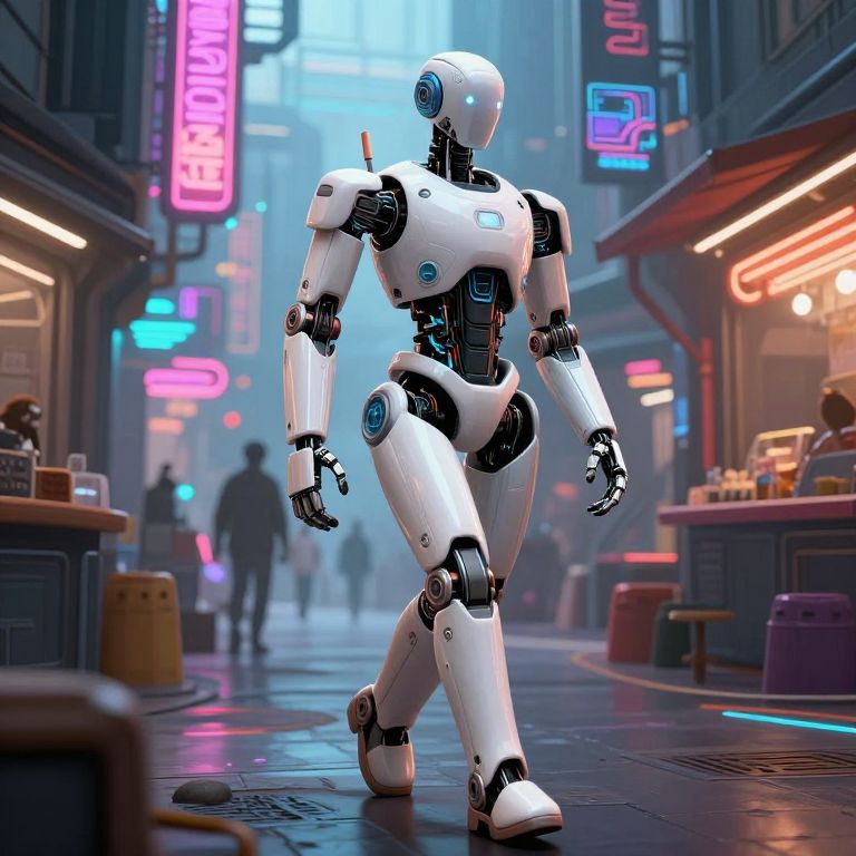 Neon-lit arcade scene with three glowing blue-eyed robots and a person in a jacket, standing in front of colorful arcade machines.