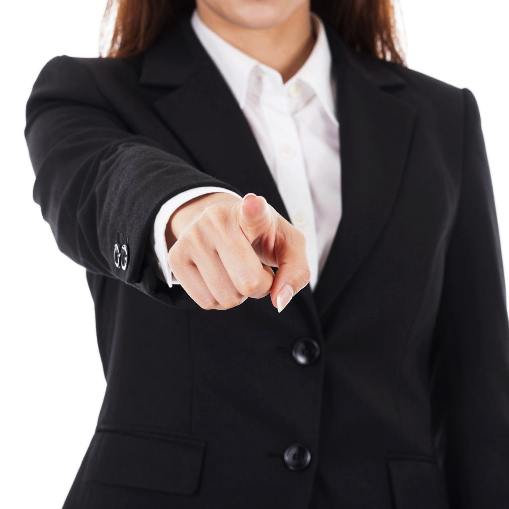 A close-up photograph of a woman with light brown hair, wearing a dark blue suit jacket over a light blue shirt. Her face is partially out of frame, but she has red lipstick. She's pointing directly at the camera with her right index finger, which is the focus of the image. The background is plain white, making her and her gesture stand out.