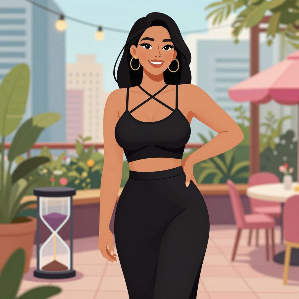 Digital illustration of a smiling woman with medium skin tone, black hair, hoop earrings, black strappy top, and high-waisted pants, standing