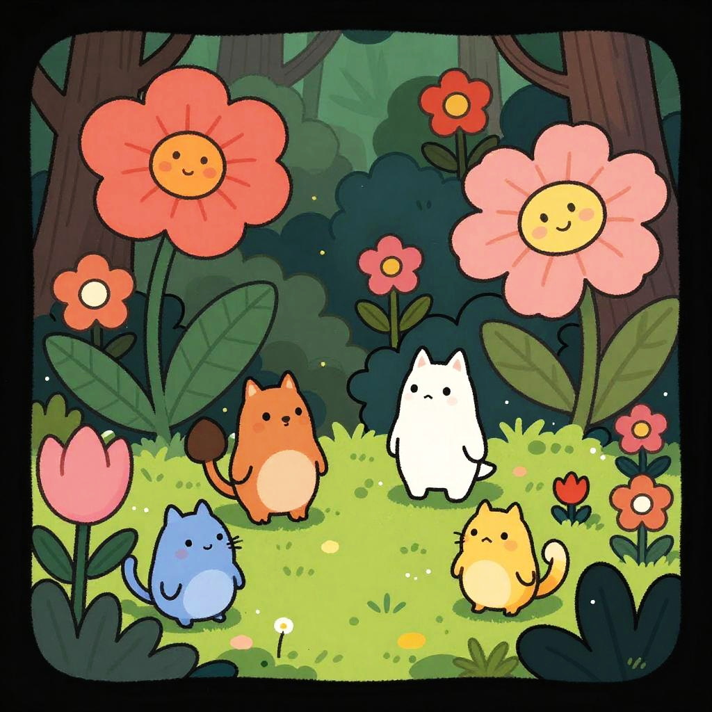 This is a digital drawing in a cute, cartoon style. It features five small, round, cat-like creatures with simple, expressive faces, standing among vibrant flowers in a lush forest. The creatures, colored orange, white, blue, yellow, and another orange, are surrounded by large, colorful flowers with smiling yellow centers. The background shows dark green trees and foliage, creating a contrast with the bright flowers and creatures. The flowers include pink, red, and orange blooms with large green leaves. The forest floor is covered in light green grass, and small white flowers are scattered throughout. The overall image has a whimsical, playful feel.