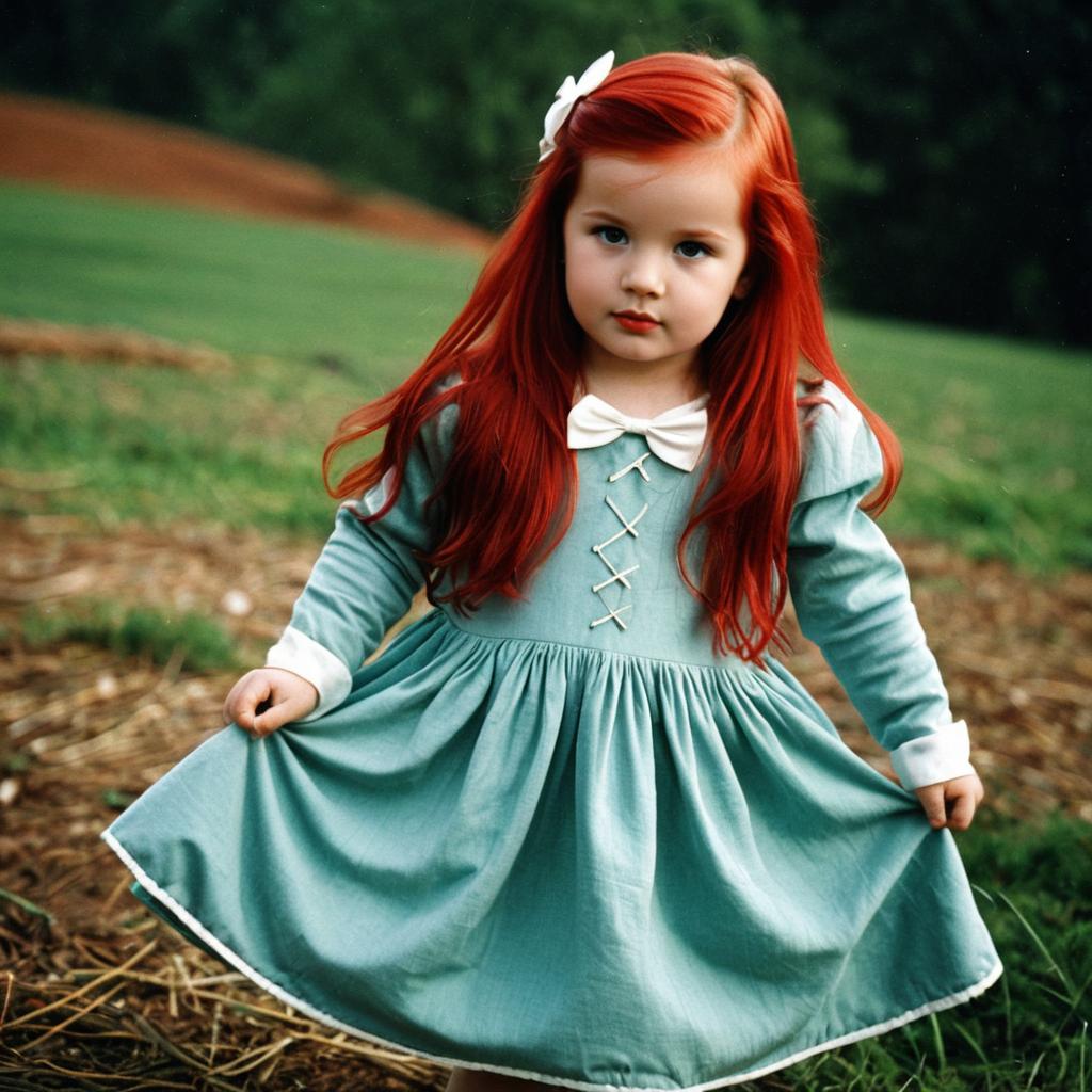 Portrait of a young blonde toddler girl with twin braids, wearing a blue dress with puffy short sleeves and detailed embroidery. She has light skin with freckles and is sitting outdoors on grass, looking directly at the camera with a calm expression.