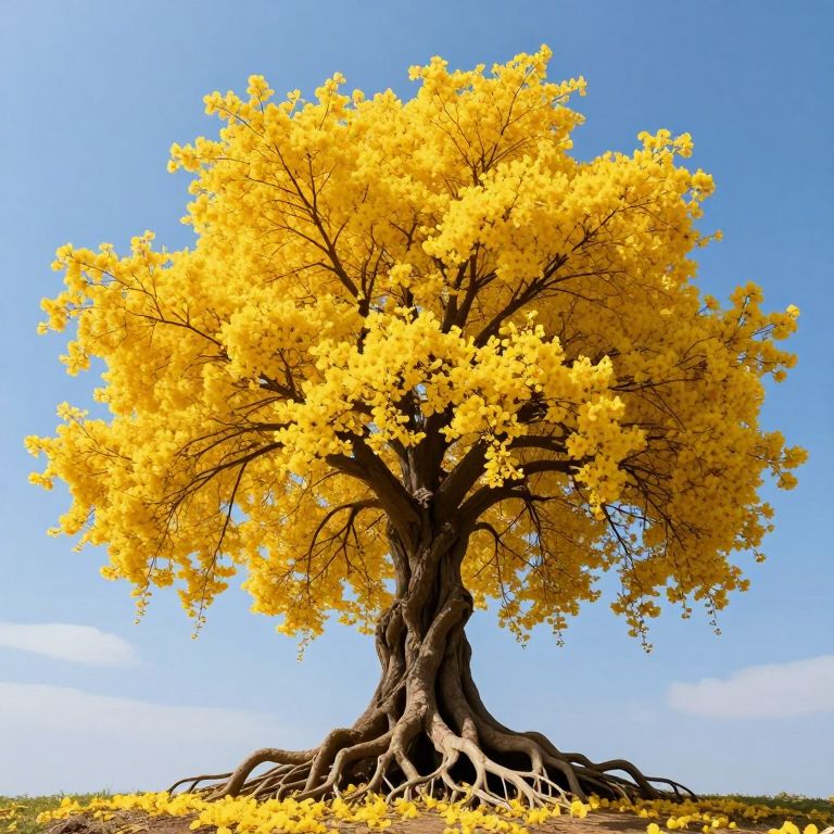 Photograph of a large, sturdy tree with a thick, twisted trunk and exposed roots. The tree is adorned with bright yellow flowers covering its entire canopy. The vivid yellow contrasts with the clear blue sky in the background. The ground beneath the tree is carpeted with fallen yellow petals. The sunlight enhances the colors, giving the scene a vibrant, almost surreal quality. The tree is centered in the image, with no other objects or people present.
