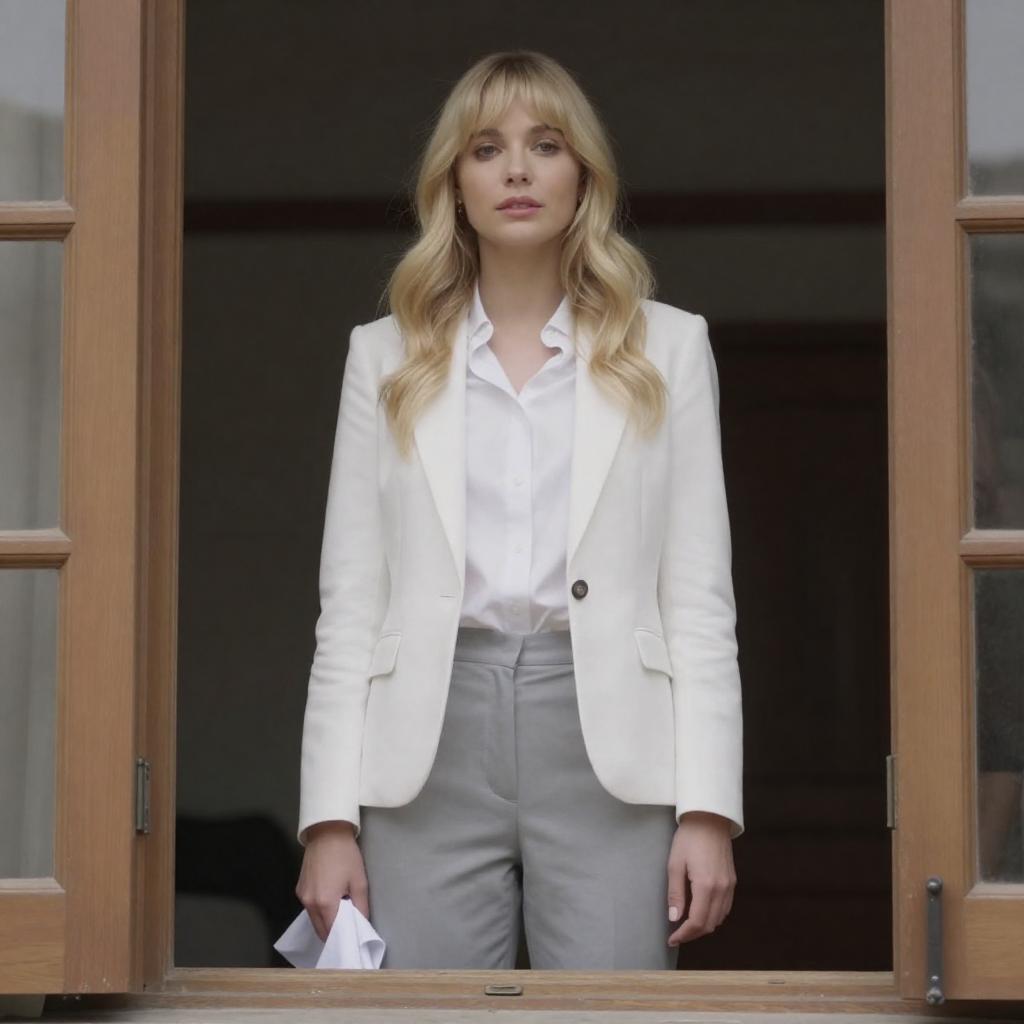 Portrait of a blonde woman with fair skin and shoulder-length hair, wearing a white blazer. She is holding a decorative, multicolored folding fan with intricate designs in her right hand and gazes to the right with a slight smile. The background is blurred with soft lighting.