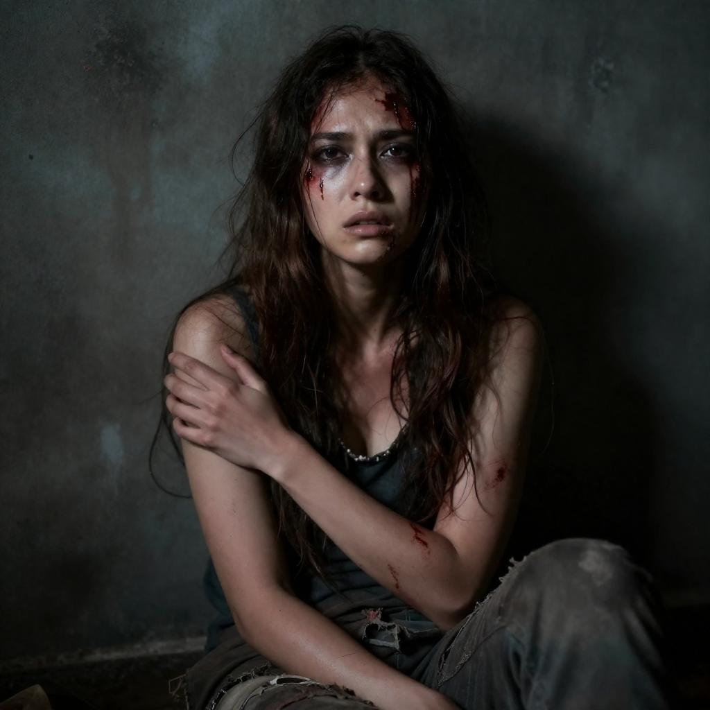 Photograph of a woman with long, dirty brown hair, blood-stained face and arms, sitting against a grimy, dark wall. She has a distressed, intense expression, wearing tattered clothes. She holds her left arm across her chest. Dim, grim setting.