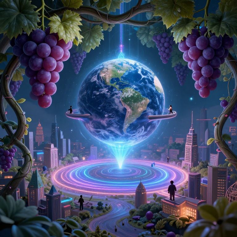 This digitally created fantasy illustration features a surreal cityscape with a glowing, floating Earth at its center, surrounded by vibrant purple grapes and green leaves. The Earth, illuminated with a blue-white light, hovers above a neon pink and blue circular energy field. Silhouetted figures stand on rooftops and the energy field, adding a sense of scale. The background includes a mix of futuristic skyscrapers and classical architecture, set against a dark, starry sky. The image blends elements of fantasy and science fiction, using bright, contrasting colors and detailed textures to create a mystical, otherworldly atmosphere.