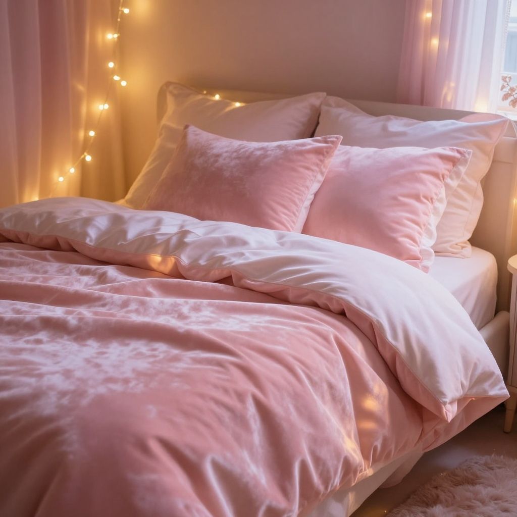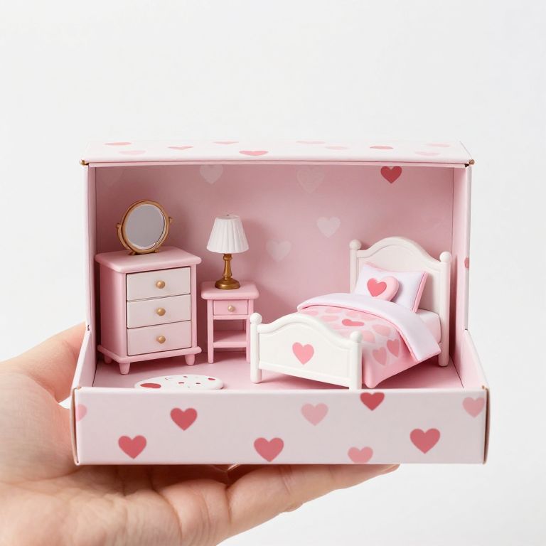 Miniature pink bedroom scene with white bed, heart-patterned bedding, nightstand, lamp, and dresser, held in a hand. Photorealistic