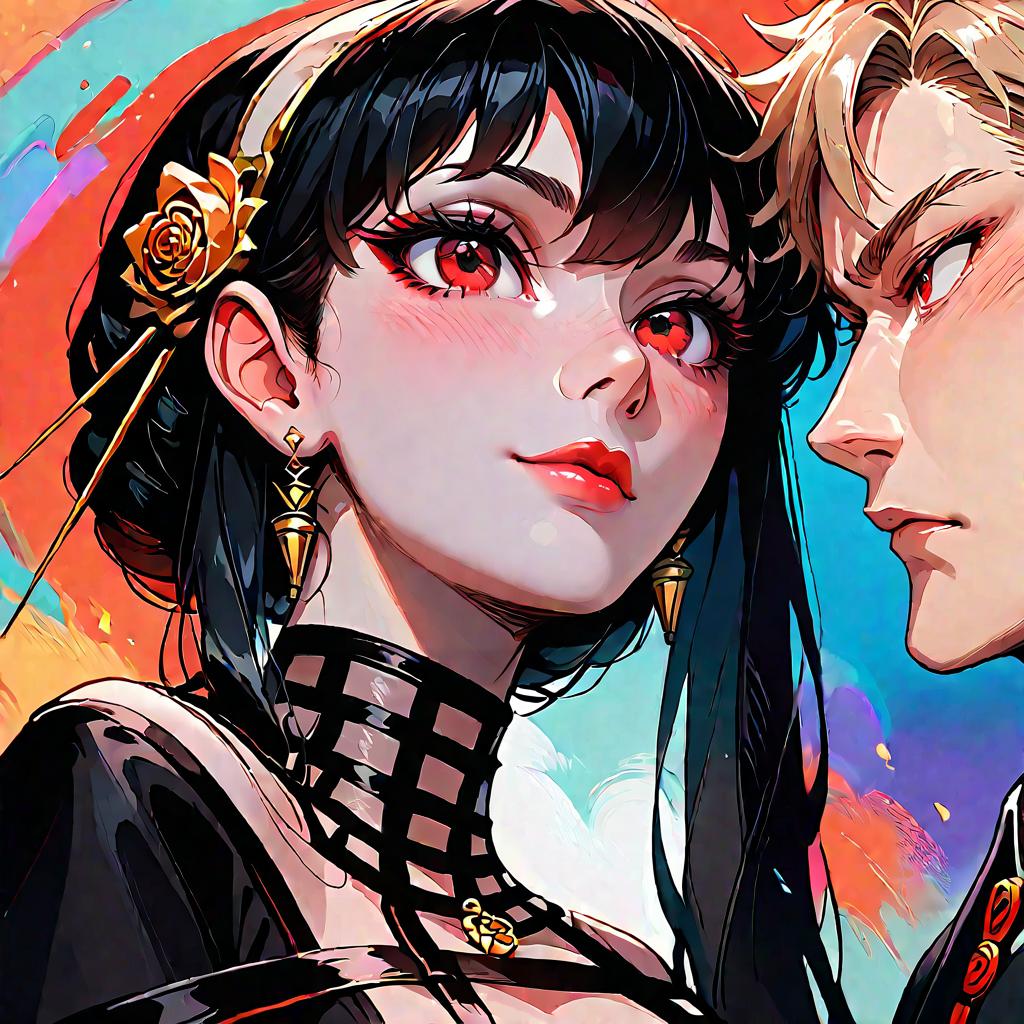 Score_9, score_8_up, source_anime, upper body, split screen, splitscreen, yor briar, red eyes, black dress, twilight \(spy x family\), 1boy
