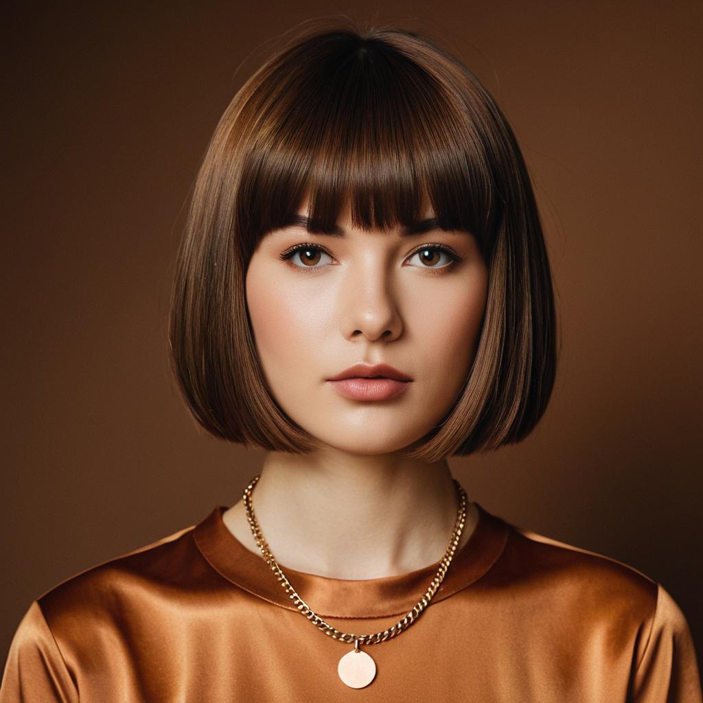 Brown bowl cut wig hair, photo of young woman with straight, bob-cut brown hair, blunt bangs, wearing copper satin shirt, layered gold necklaces, brown ured background, front view, realistic portrait, soft lighting, neutral expression, mid-length shot, high-quality photography, fashion model style