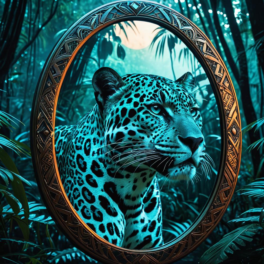 Digital art of an enigmatic jaguar with bioluminescent tribal tattoos, seen through an intricately designed oval mirror. The setting is a mystical jungle at dawn with dense foliage and soft blue light creating a mysterious atmosphere. High-resolution 8k concept art with detailed tribal patterns glowing on the jaguar's fur.