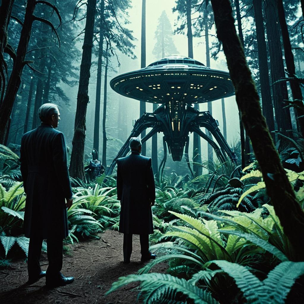 Highly detailed, film still from a 2027 sci-fi movie, set in 2500, showing a diplomat negotiating with an alien leader in a bio-luminescent forest across a strange landscape with alien plants, formal interstellar robes, atmospheric lighting, reflective eyes, 35mm macro lens, live action, nice composition