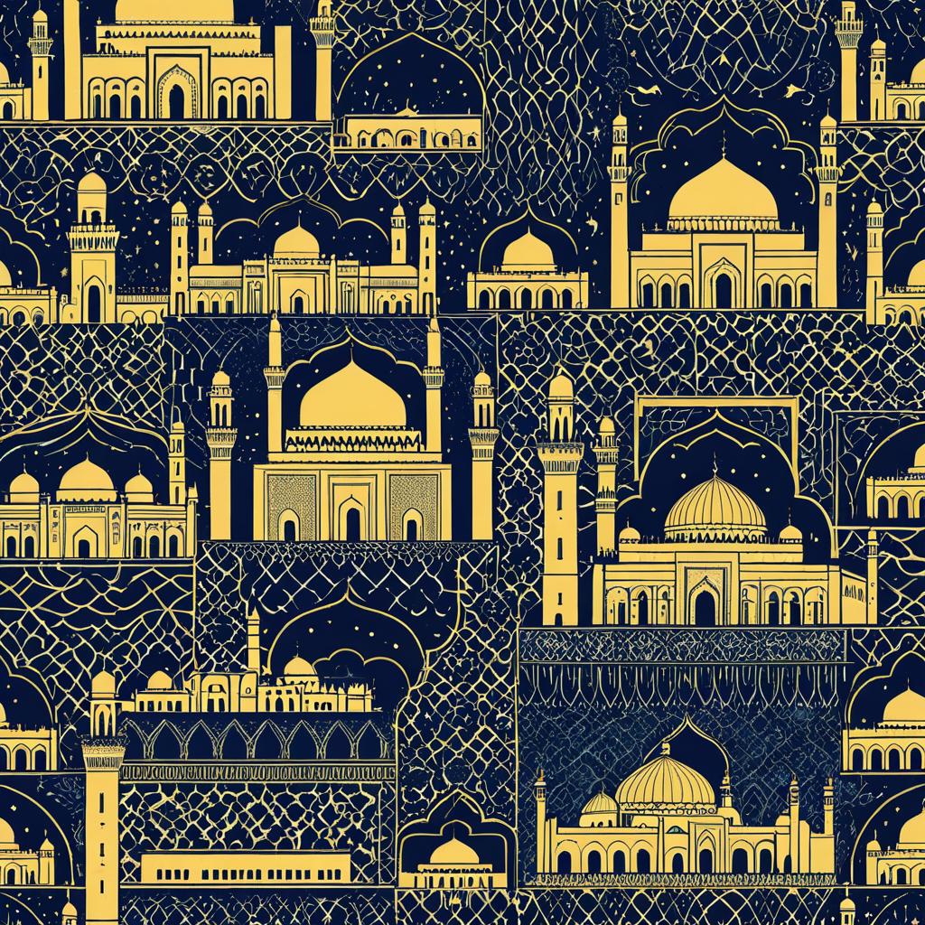 Wallpaper pattern featuring Moroccan and Turkish landmarks, including Hassan II Mosque, Hagia Sophia, aerial view of Casablanca city, depicted in elegant line art, warm yellow on navy blue background, highly detailed, sophisticated design