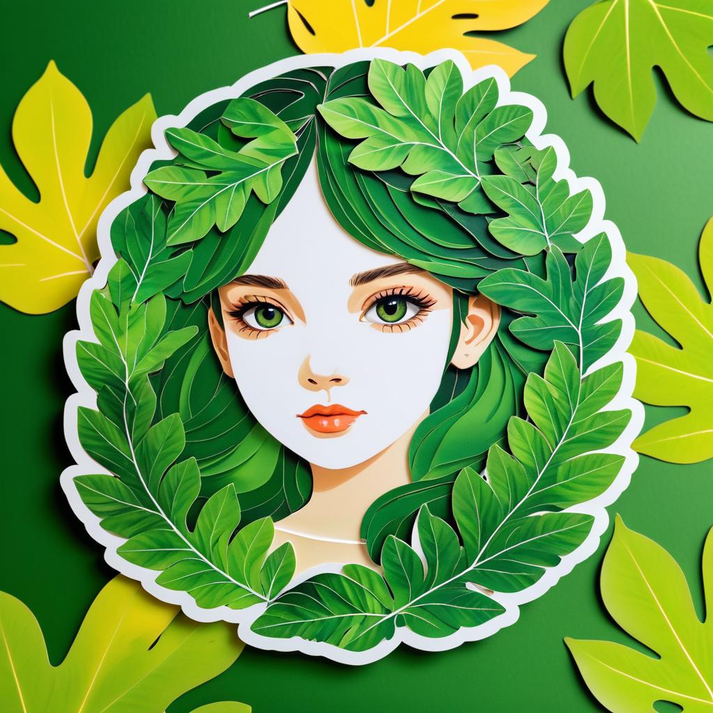 A detailed laptop sticker featuring a portrait of a young girl composed entirely of green leaves. The leaves are arranged creatively to form the hair, facial features, and colorful lips of the girl with a white background, blending natural elements with digital art.