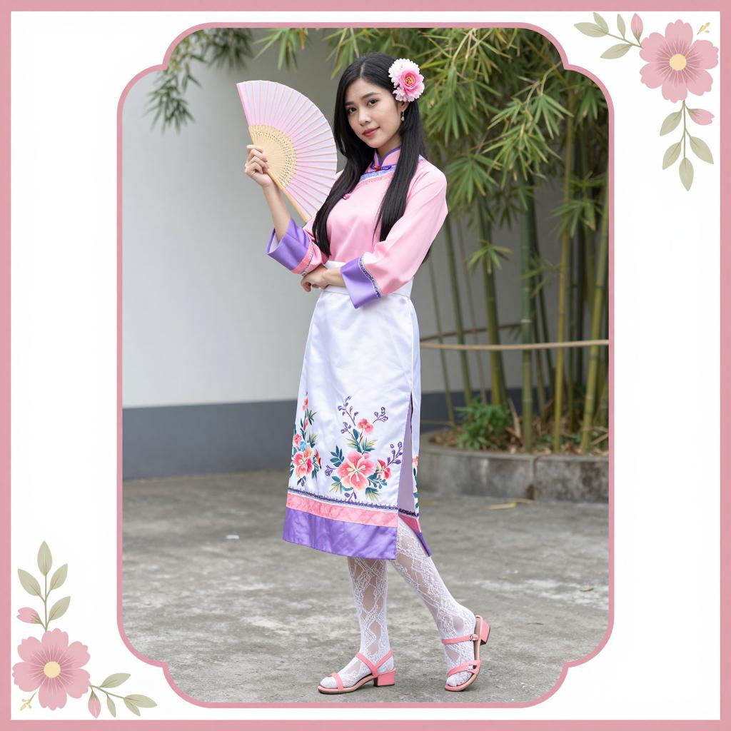 Asian woman in pink, purple, and white traditional dress with floral patterns. Long black hair, flower headpiece. Holding pink and white paper fan. Wearing white lace-patterned tights, pink sandals. Standing outdoors on a concrete path. Background includes bamboo and white wall. Decorative frame with floral patterns surrounds the image.