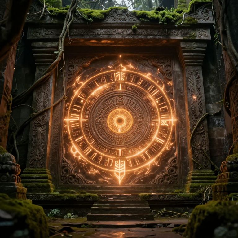 Photograph of a glowing, circular, ancient stone clock with fire-like orange light, set in a moss-covered, ruined temple entrance.