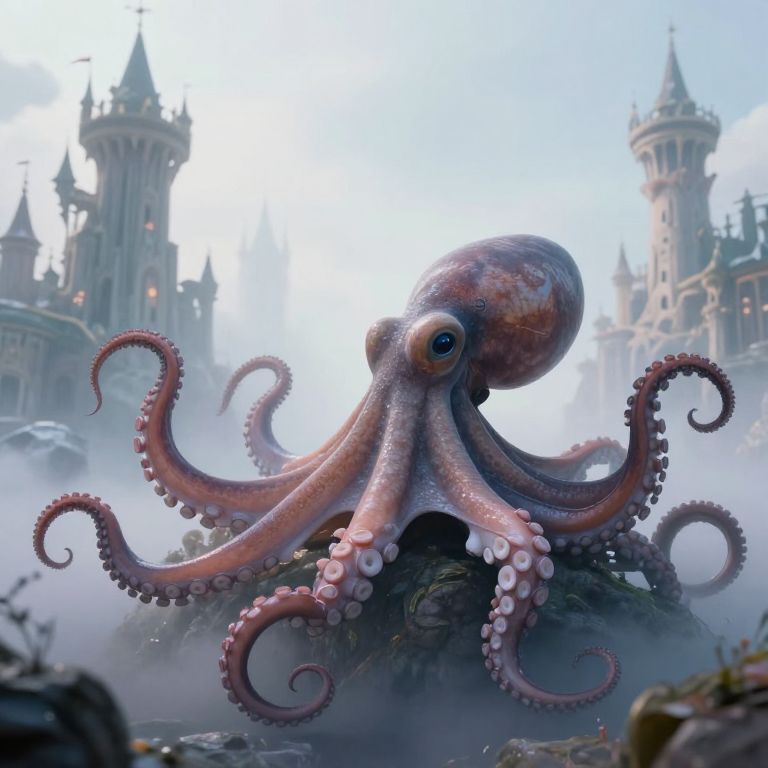 Amidst the ethereal stillness of a dreamlike realm, an octopus's colossal form emerges, its tentacles coiled like ancient wisdom, while towering castles of imagination rise and fall in the distance, symbolizing the transient nature of creation and the boundless potential of the mind.