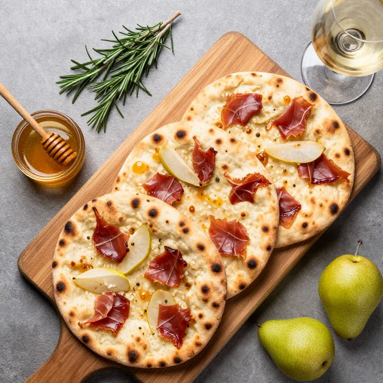Photograph of two burnt flatbreads with apple slices and prosciutto, on a wooden board, with honey, rosemary, and pears