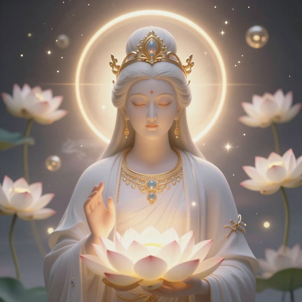 Divine figure with serene expression, crowned with a halo of light, surrounded by floating lotus flowers and soft glowing orbs, mystical and spiritual atmosphere