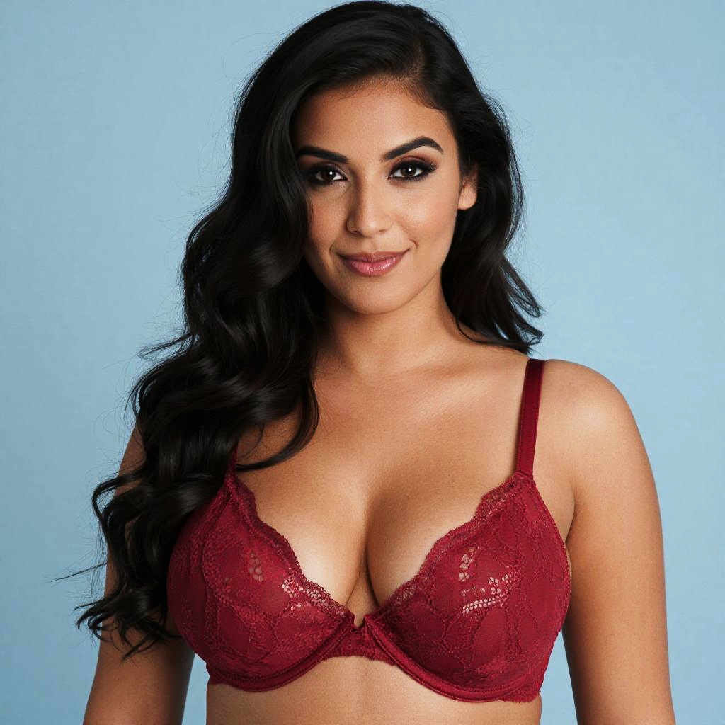 Photograph of a beautiful woman with long, wavy black hair, wearing a red lace bra that accentuates her large breasts. She has a light brown skin tone, dark eyebrows, and is smiling slightly with a subtle makeup look featuring dark eyeliner and nude lipstick. The background is a simple, solid light blue. She looks directly at the camera, exuding confidence and charm.