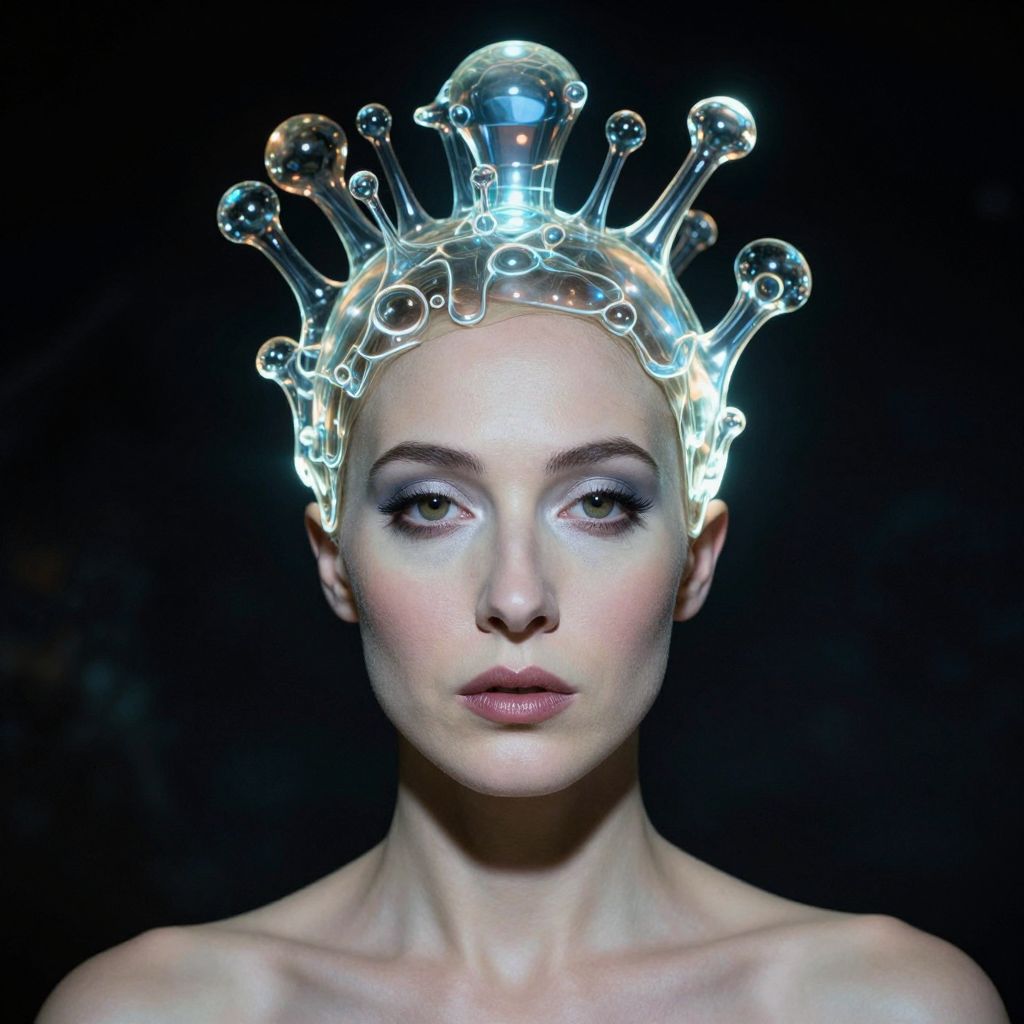 Photograph of a pale-skinned woman with glowing, ethereal crown of transparent, glass-like orbs, against a dark background. She has subtle makeup
