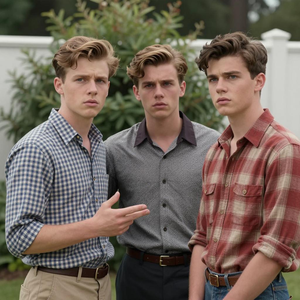 Three young men standing close together. All have fair skin, dark brown hair, and blue eyes. First man on left wears plaid shirt, gestures with right hand. Middle man in gray patterned shirt with dark collar. Right man in red and beige plaid shirt, arms at sides. Background: green shrubs, white fence. All have intense expressions, looking off to the right. Greenery and trees in background. Mid-20th century fashion style.