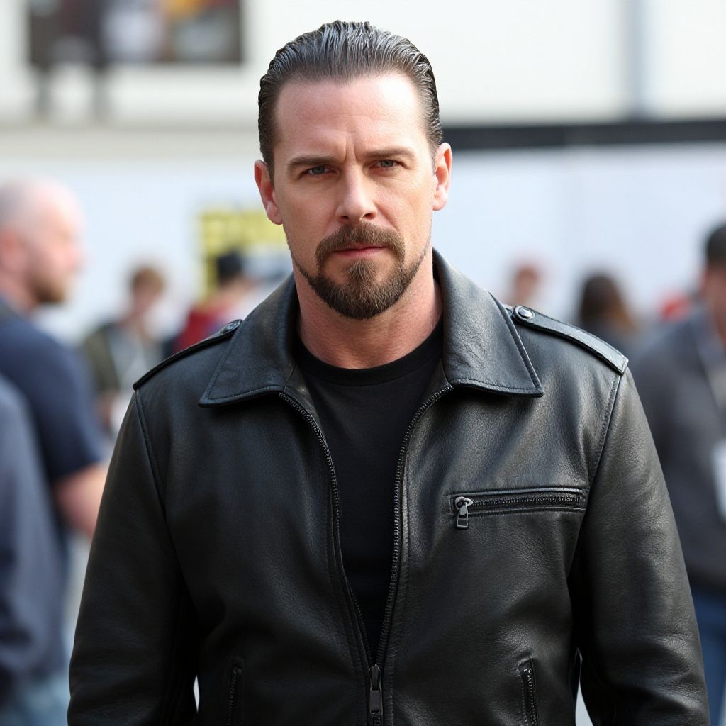 Photograph of a serious-looking, bearded man with slicked-back hair, wearing a black leather jacket, standing in a blurred, bustling outdoor crowd