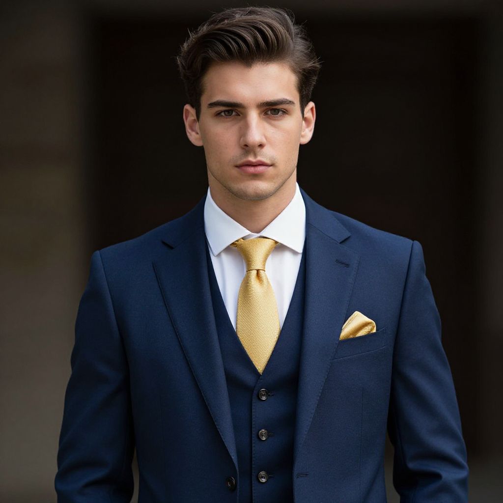 Photograph of a handsome young man with light skin and dark brown, neatly styled hair. He's wearing a navy blue three-piece suit with a white dress shirt and a golden tie. There's a matching golden pocket square in his left breast pocket. He's standing against a dark, blurry background, looking directly at the camera with a serious expression.