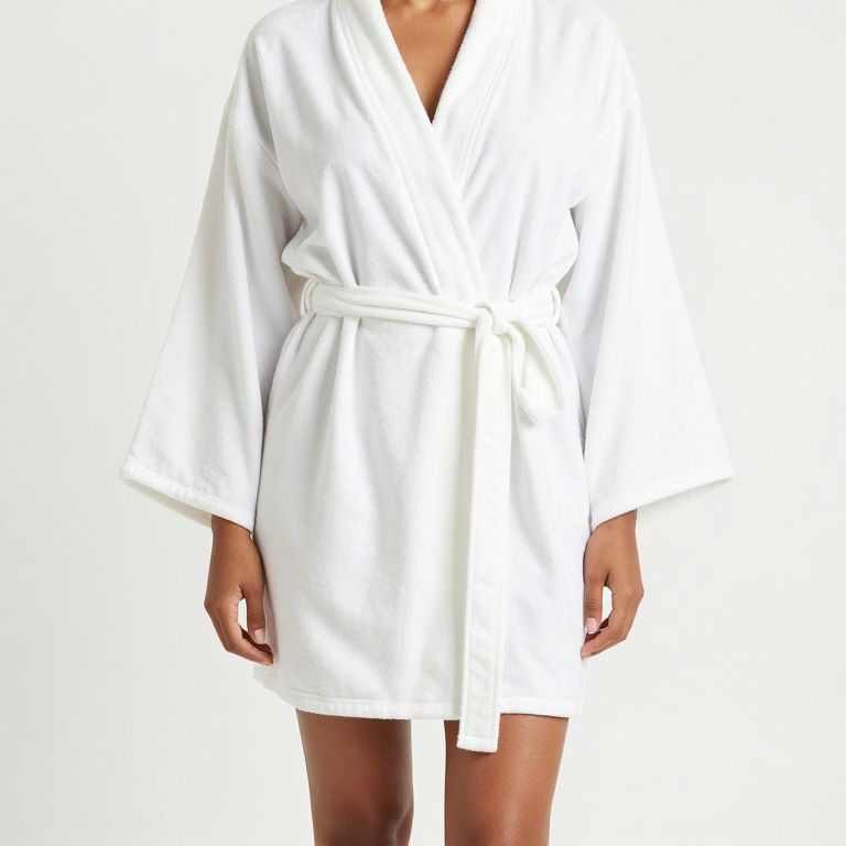 Photograph of a person wearing a white, long-sleeve, V-neck robe with a tied waist, against a plain white background.