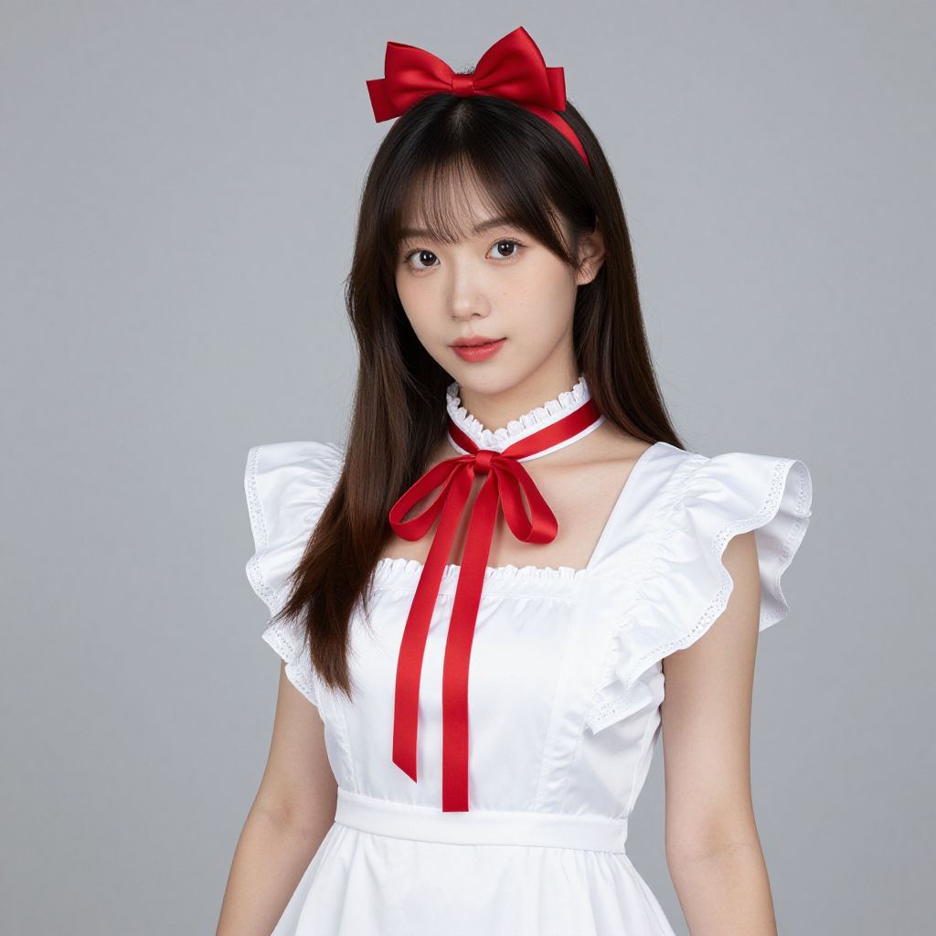 Photograph of an East Asian woman with fair skin and long, straight black hair, wearing a white, short-sleeved, ruffled dress with a red ribbon bow at the neck. She also has a matching red ribbon bow in her hair. Her makeup is minimal, with subtle red lipstick. The background is a plain, light gray. The dress has a delicate, lace-like trim around the neckline, adding a touch of elegance. Her expression is neutral, and she gazes directly at the camera, exuding a sweet and innocent vibe. The lighting is even, highlighting her features and the details of her outfit.