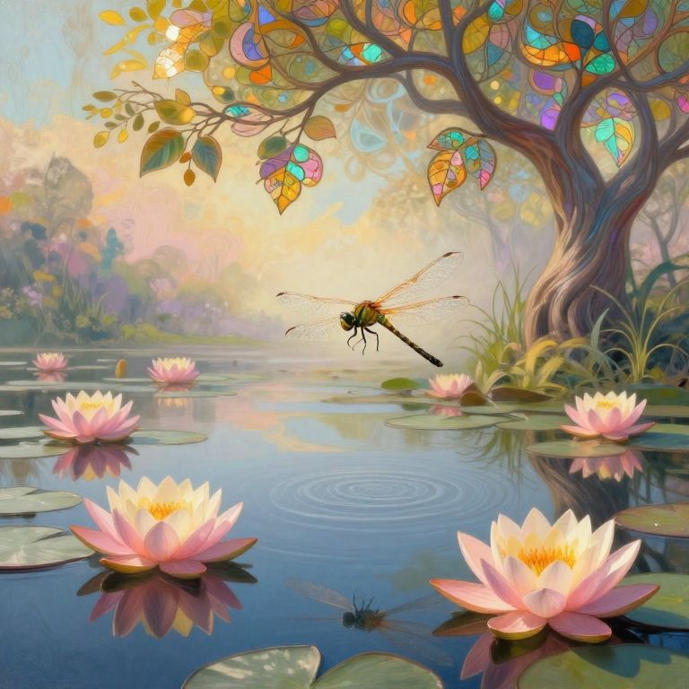 A surreal landscape emerges from the viewpoint of a dragonfly, blending the fluidity of Art Nouveau with the softness of Impressionism. Amidst this dreamlike setting, water lilies gracefully float on a tranquil pond, their vivid hues and tender petals casting shimmering reflections across the mirror-like surface under the warm sunlight. A whimsical tree in the background mimics the intricate patterns of Art Nouveau, its sinuous branches adorned with iridescent leaves that glimmer like stained glass. The scene is painted with a dreamy palette, invoking a sense of peace and enchantment as the eye follows the gentle ripples on the water to the captivating dance of dragonflies circling around the lilies in this mesmerizing visual symphony.