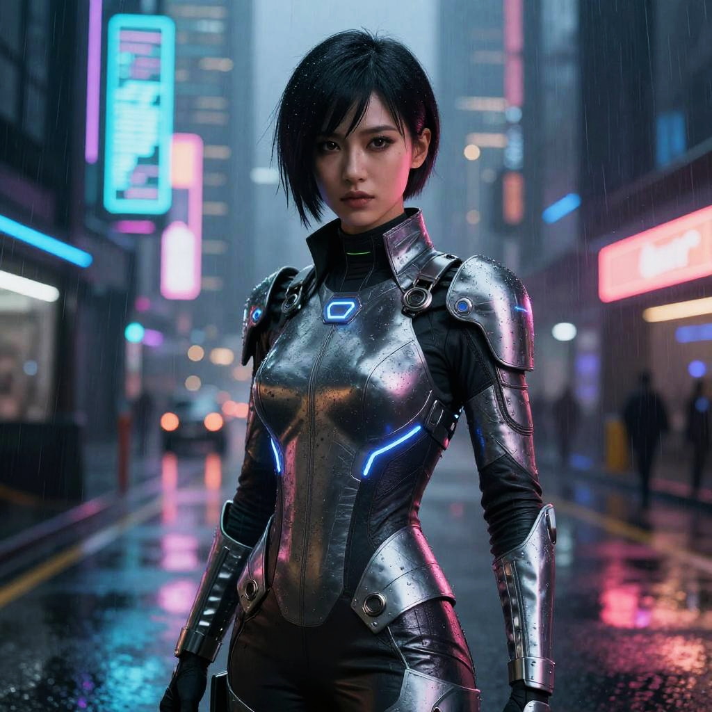 Female black hair green eyes cyberpunk cityscape, neon lights reflecting on wet streets, futuristic attire with glowing accessories, intense gaze, detailed urban background, moody atmosphere, dynamic composition