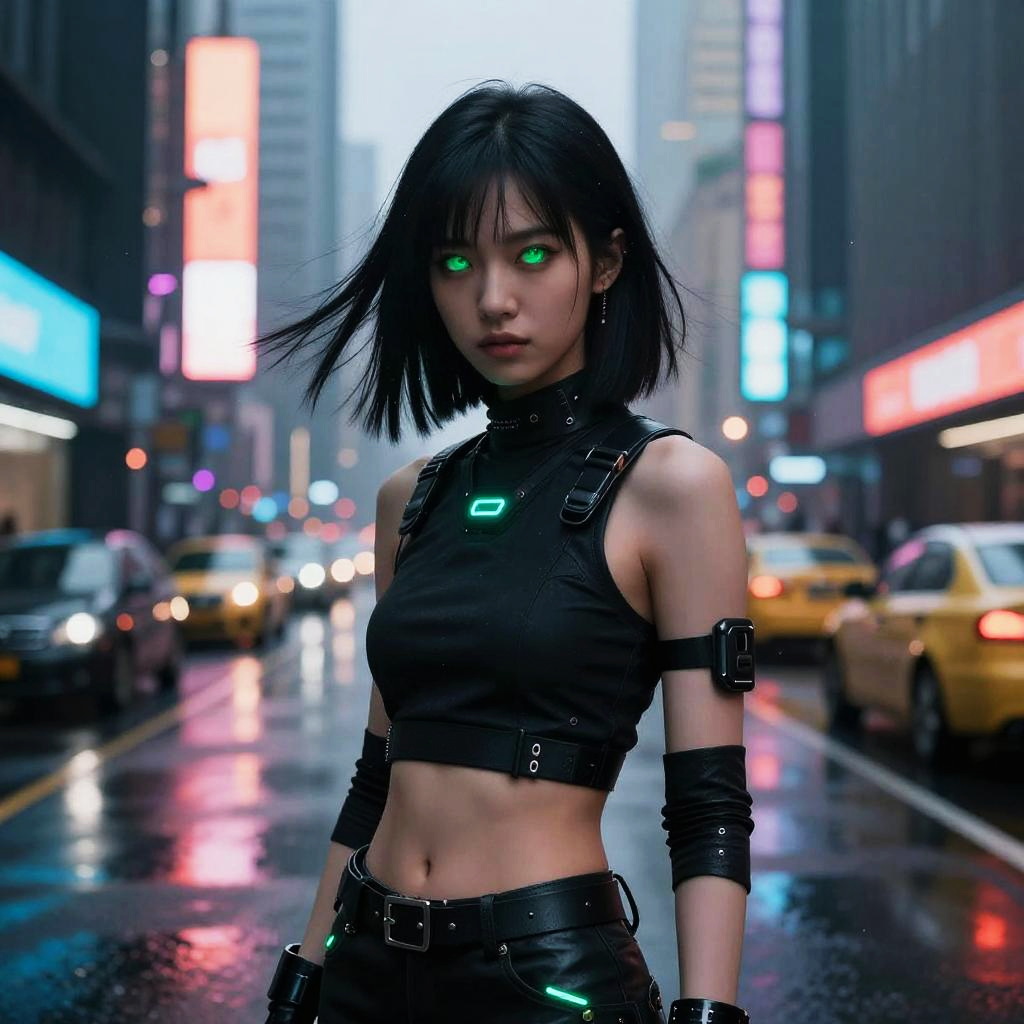 Cyberpunk photograph: Asian woman with black bob, glowing green eyes, leather crop top and pants, standing on rainy city street with neon lights and