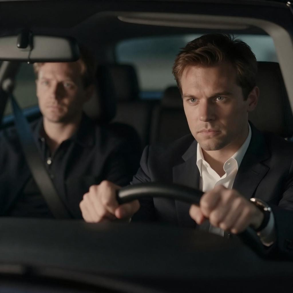 Portrait of a serious-looking man with short brown hair and a light beard, sitting in a dark car with red leather seats. He wears a dark sweater and looks intently forward, focused on driving. The car interior is modern and the background outside the window is blurred with light reflections.