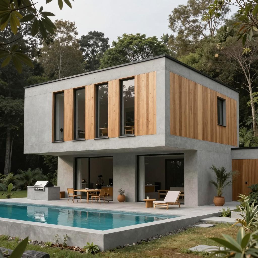 Kawaii Community an exterior view of a contemporary and minimalistic 2 story horizontal and rectangular home with double height walls, using wood and concrete, tall and narrow windows, front concrete porch with infinity pool, bbq area and exterior seating space, surrounded by a forest, hyper-realistic,