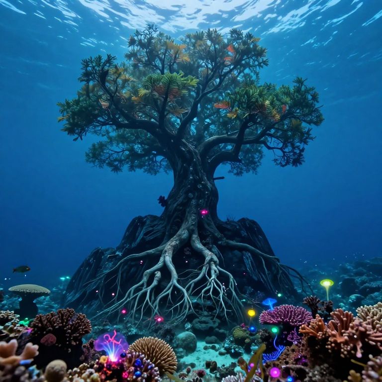 Imagine an ethereal underwater scene where an age-old tree grows on a massive submerged mountain, its roots anchored to the jagged rocks as they stretch towards the ocean's surface. This mystical landscape is bathed in luminescent light from bioluminescent creatures, creating an enchanting spectrum of colors across the coral reefs and swirling tree leaves. The composition reflects both the serene allure of marine life and a sense of enigma, sparking curiosity at the harmonious blend of land and sea as if envisioned by the masterful strokes of Dali-inspired surrealism enhanced with FLUX.1's cutting-edge synthesis.