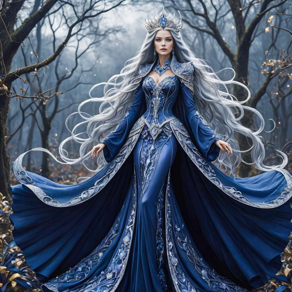 Fantasy creature, Tall and slender, Long flowing silver hair, mardi gras outfit, deep blue garment with shimmering scales, crystal-studded shoes and a tiara, sapphire accessories, ethereal magical