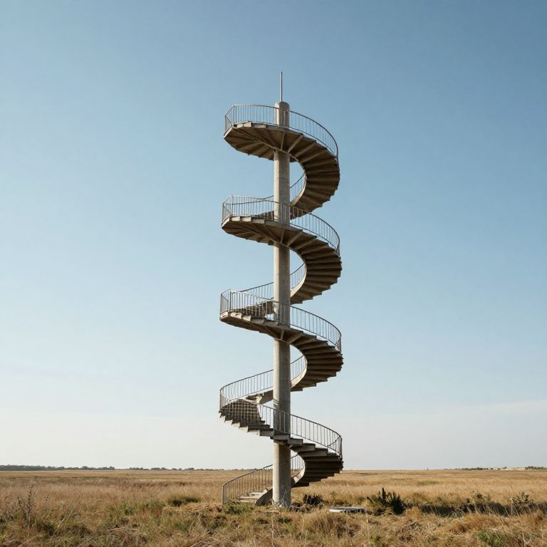 A sky doesn't exist overhead—for miles above the ground, a field of floating staircases spirals endlessly into the unknown.