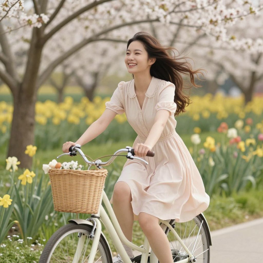 Embracing the gentle breeze and the promise of renewal, a woman in a blush dress pedals through a vibrant spring garden, her laughter echoing the timeless dance between freedom and serenity.