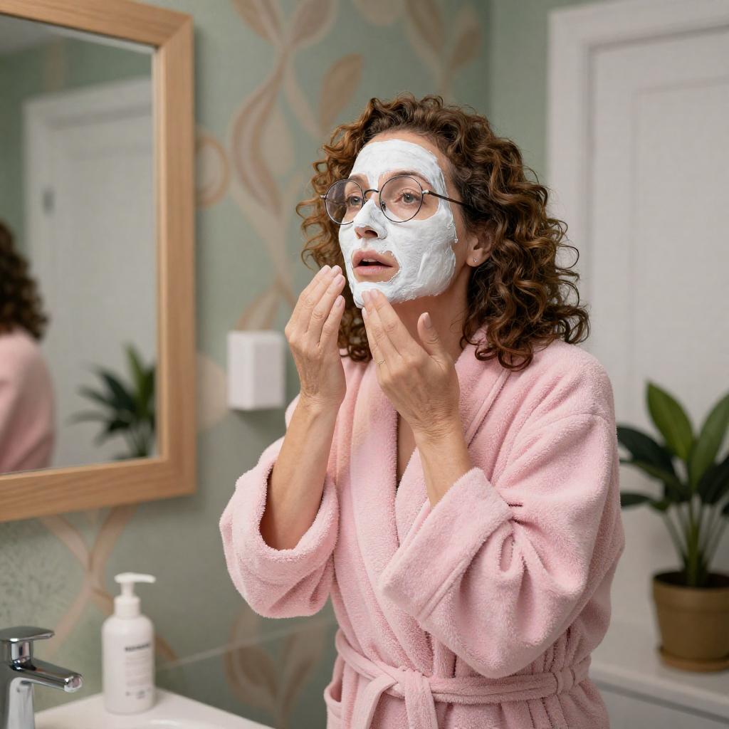 Middle-aged woman with curly brown hair and round glasses, applying white face mask, wearing pink towel robe, standing in bathroom. Mirror on left, green and brown patterned wallpaper, potted plant on right. Hand near mouth, slightly open. Bright light.