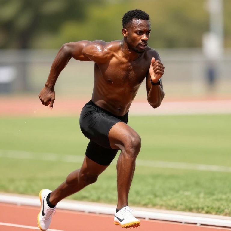 Oiled up black guy sprinting on a track field, muscles taut and glistening from oil and sweat, energetic and dynamic motion captured mid-stride, bright daylight, athletic atmosphere, photorealistic sports portrait